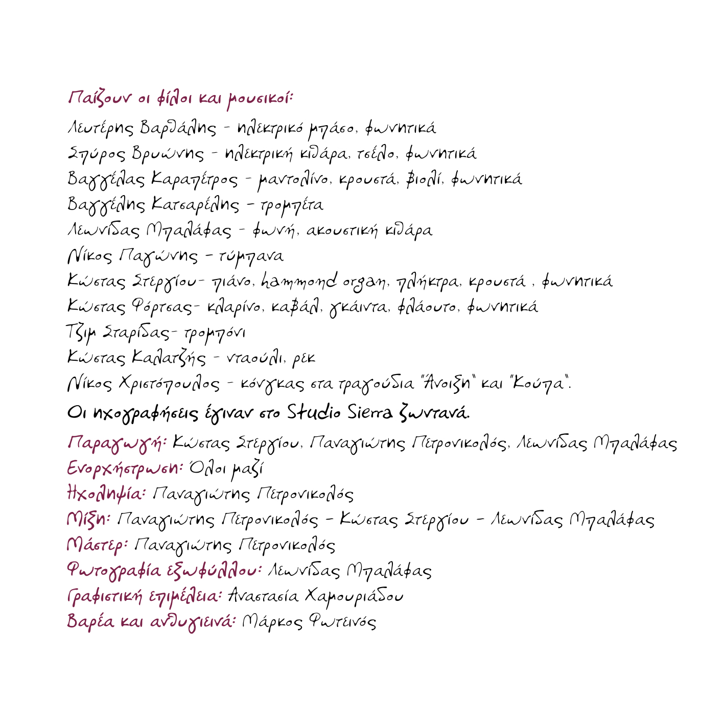 Από λάθος δεν γράφτηκαν στην παραγωγή τα ονόματα των Κώστα Στέργιου και Παναγιώτη Πετρονικολού, καθώς και το όνομα του Νίκου Χριστόπουλου που έπαιξε κρουστά στην «Κούπα».